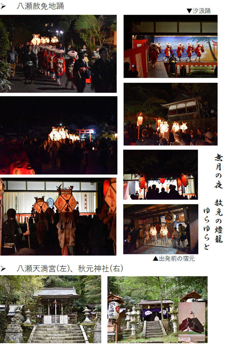 《ご案内》 午後8時、燈籠を被り女装した少年(燈籠着(とろぎ))が各町の宿元(4か所)から門口に集まり、祭りがスタート。踊り子の少女、狂言等を行う新発意(しんぼち)、音頭取りらと行列を組み、秋元神社(八瀬天満宮)へ向かう。暗い参道に燈籠と提灯の明かりがゆら・ゆらと揺れ、幻想的な光景だ。神社石段で音頭取りが「道歌」を静かに歌い一段一段上がっていき、屋形に着くと燈籠着がその周りをまわる。 舞台では三番叟(そう)(※1)が演じられたのち、踊り子たちによる「汐汲踊」「花摘踊」が行われ、続いて新発意たちによる狂言が奉納される。やがて「狩場踊」音頭がはじまり、「いざや帰らんわが宿へ」と歌い始めると燈籠が宿元へ帰っていき、祭りは終わる。 八瀬赦免地踊は10月の秋元祭で行われる踊り。主役の女装した少年が被る燈籠は高さ約70センチの切子燈籠で、赤紙に花鳥や武者絵などが透かし彫りされ白の地紙に張ったもの。燈籠は4対8基作られ祭りが行われる。 この踊りは、1707(宝永4)年に起こった延暦寺との山界相論で、八瀬に有利な裁定を下した老中秋元但馬守喬知(たかとも)に感謝し、氏神である八瀬天満宮の横に綸旨宮(りんじのみや)を建て秋元神社とし、毎年秋に奉納するもの。八瀬の村人は中世より「八瀬童子」と呼ばれ、薪炭の生産・商売を生業としつつ、朝廷・延暦寺などの駕輿丁役や雑役を担い、諸課役免除、諸商売免許の権利を得つづけたが、江戸中期に起きた延暦寺との山界相論でその基盤を失いかけたので、秋元但馬守の裁定がよほどうれしかったのだろう。その後、燈籠踊りは今日まで受け継がれてきた。京都市内で燈籠踊りの面影をとどめているところは少なく、現在では左京区久多の花笠踊と八瀬赦免地踊を数えるのみであり、貴重な伝統行事だ。 八瀬は、上高野から高野川に沿って北東に延びる鯖街道(国道367号)沿いの集落だ。街道沿いの延長が約5キロと長く、この地域を走る京都バスのバス停は、八瀬駅前から花尻橋まで11もある。ここに4ヶ町、804世帯、1,634人(2020国勢調査)が暮らしている。 秋元神社のある八瀬天満宮はバス停「ふるさと前」南の鳥居から東に行った山際にある。石段を登って正面に本殿、その右手に秋元神社が鎮座する。この天満宮は菅原道真公を祀るために10世紀に建立されたという。本殿は三間社切妻造・銅板葺きの建物で1844(天保15)年に再建されたもの。蟇股表面に臥牛、裏面に星梅紋を配し、天満宮としての特徴を備えている。背面扉の内側には十一面観音絵図が納められており神社建築として珍しい。街道脇の鳥居から山際まで田畑の中を参道が一本通り、その先に木々に包まれて社殿が並ぶ境内は、比叡山麓の歴史的風土を構成する重要な要素となっている。 八瀬は比叡山延暦寺に通じるケーブルカーの出発地でもある。バス停「八瀬駅前」の東にケーブル八瀬駅があり、全長1.3キロの叡山ケーブルは1925(大正14)年に開業。戦時中不要不急線として休止したが、1946(昭和21)年に再開。高低差はケーブルカーとして日本最大の561メートル。八瀬駅から比叡駅までの9分間、比叡山から見た京都市街の眺望が楽しめる。 鯖街道を南西に下り、上高野のバス停「上橋」近くには崇道神社がある。長岡京廃都理由で紹介した怨霊説に登場する早良親王を祀る神社だ。平安京遷都後の800(延暦19)年、桓武天皇は早良親王に崇道天皇の名を追贈し祟りを避けようとしており、その霊を慰めるために創建されたという。一説には小野神社の旧地ともいわれ、本殿後方の山中には小野妹子の子、毛人(えみし)の墓があり、石棺中から銅板墓誌(国宝)が発見されている。 平安京の北東方向(鬼門)に位置する八瀬は古くから皇室との関係が深く、村の歴史を伝える祭りが今も行われていた。それだけでなく、長岡京から平安京への遷都のきっかけとなった早良親王のみを祭神とする神社が、天皇の名で鯖街道沿いに存在していた。 |