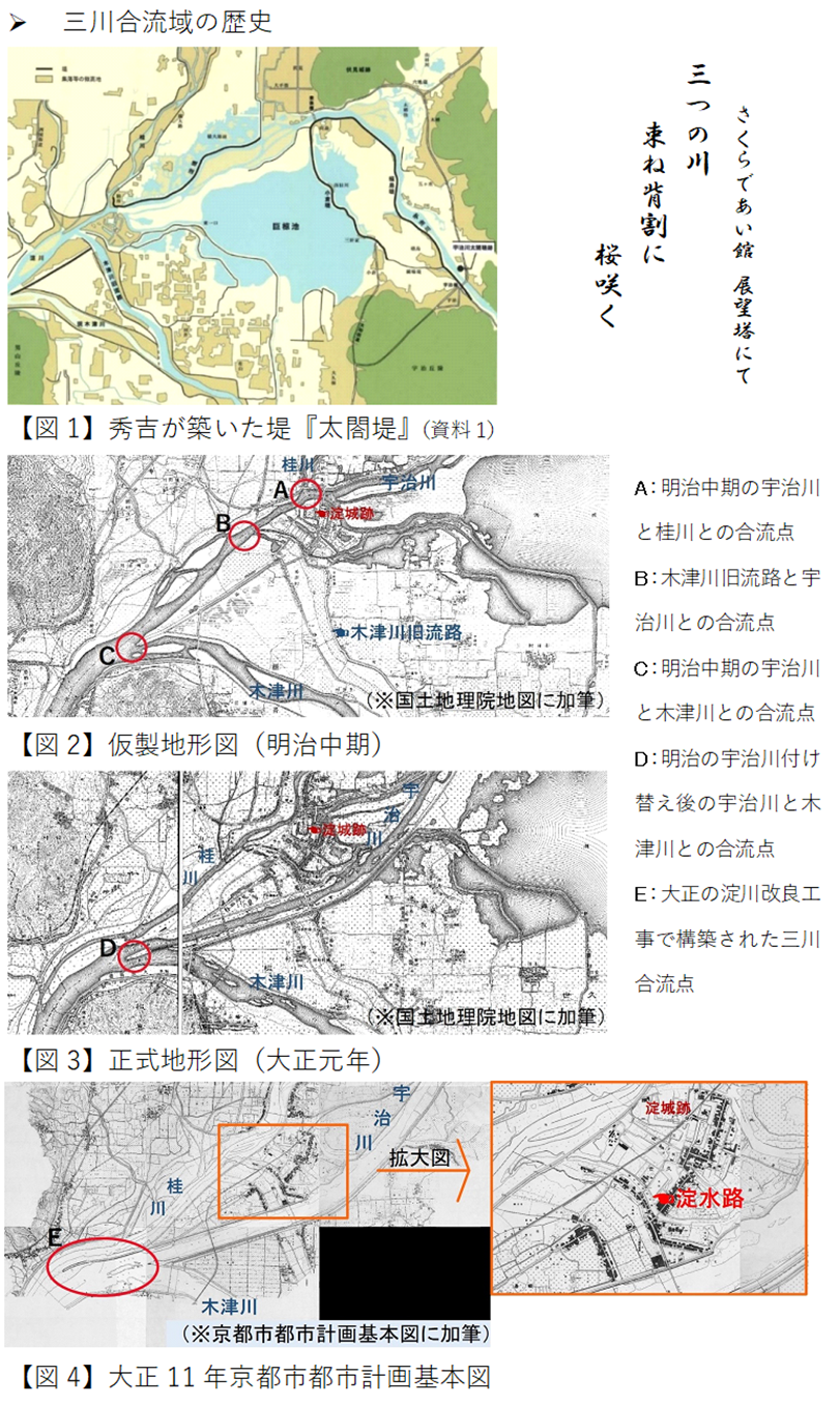 《ご案内》 桂川、宇治川、木津川の三川が、天王山と男山に挟まれ合流する地点には全長1.4キロメートルの「背割堤」がある。その堤防の上には約220本の桜が連なり、春には『桜のトンネル』となって来る人を魅了する。桜の開花時期には「背割堤さくらまつり」が行われ、大勢の人たちがお花見イベントを楽しむ。また背割堤の上流部、御幸橋の袂には2017(平成29)年春に完成した「さくらであい館 展望塔」が建ち、地上25メートルから桜花の絨毯を一望することもできる。 ここの桜並木の歴史は浅い。というのも三川が合流する地点が何度も変わってきたからだ。かつて宇治川は、伏見の南にあった巨椋池に流れ込み、淀のあたりでいくつかの流れとなって桂川や木津川と合流していたが、豊臣秀吉が太閤堤を築き、宇治川を巨椋池から切り離して北に大きく彎曲させた結果、宇治川と桂川が淀の北で合流(A)し、木津川は淀の南で淀川に合流(B)していた。 明治になり、1868(明治元)年に起った木津川堤防決壊をきっかけに木津川が現在の流路に付け替えられ、宇治川との合流点が下流側(C)に移った【図2】。85(同18)年の淀川大洪水では、96(同29)年から14年かけて淀川改良工事が行われ、宇治川を淀の南(D)へ付け替えて連続堤防が造られ、宇治川と巨椋池が完全に分離された【図3】。 1917(大正6)年の台風豪雨による洪水を契機に更なる淀川改良工事が行われ、三川が合流する地点で背割堤を構築して合流点を下流に移し(E)、木津川の流量が増加しても桂川、宇治川に影響が及ばないようにした【図4】。このような経過から、木津川旧流路のあたりでは京都市、八幡市、久御山町の境界線が複雑に入り組んでいる。こうして三川が一箇所に集まり背割堤が造られたのだが、このときまだ桜並木はなかった。 昭和40年代になって余暇時間の増大やレクリエーションの多様化を背景に、淀川の河川敷を公園として整備する事業が1972(昭和47)年から始まり、背割堤地区は淀川河川公園の一つとして整備された。当初は松並木だったが、松枯れの被害が拡大したため6年後に桜に植え替えられ、あわせて遊歩道等の整備を進め88(同63)年4月に桜並木が一般開放された。桜のトンネルは今年で38年目ということになる。 背割堤の上流、御幸橋から北東約2キロのところにはもう一つの桜の名所、「淀水路の河津桜」がある。超早咲きの桜で、3月上旬には水路沿いに約300本の河津桜が見頃を迎える。淀水路は木津川旧流路の北側に位置し、大正11年の京都市都市計画基本図には「巨椋湖悪水路」と書かれている【図4拡大図】。明治期の宇治川付け替えで連続堤防が築かれたため、北側に残った沼地等の水を桂川に抜くための排水路だったのだろう。その水路を整備し、1977(昭和52)年に緑道としたのが淀緑地公園である。淀水路の河津桜は、住民が2本の苗を淀緑地公園に植えたのがきっかけとなり、地元の愛護協力会や「淀さくらを育てる会」の皆さんが植樹し、育ててきたものだ。2月になると桜の開花が始まり、大勢の人々が一足早い桜を楽しんでいる。 背割堤が公共主体の桜並木、淀水路が住民主体の桜並木ということであり、それぞれに趣がある。 (続く) |