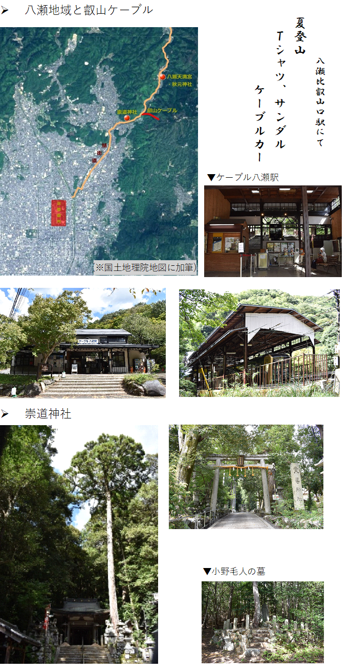 《ご案内》 午後8時、燈籠を被り女装した少年(燈籠着(とろぎ))が各町の宿元(4か所)から門口に集まり、祭りがスタート。踊り子の少女、狂言等を行う新発意(しんぼち)、音頭取りらと行列を組み、秋元神社(八瀬天満宮)へ向かう。暗い参道に燈籠と提灯の明かりがゆら・ゆらと揺れ、幻想的な光景だ。神社石段で音頭取りが「道歌」を静かに歌い一段一段上がっていき、屋形に着くと燈籠着がその周りをまわる。 舞台では三番叟(そう)(※1)が演じられたのち、踊り子たちによる「汐汲踊」「花摘踊」が行われ、続いて新発意たちによる狂言が奉納される。やがて「狩場踊」音頭がはじまり、「いざや帰らんわが宿へ」と歌い始めると燈籠が宿元へ帰っていき、祭りは終わる。 八瀬赦免地踊は10月の秋元祭で行われる踊り。主役の女装した少年が被る燈籠は高さ約70センチの切子燈籠で、赤紙に花鳥や武者絵などが透かし彫りされ白の地紙に張ったもの。燈籠は4対8基作られ祭りが行われる。 この踊りは、1707(宝永4)年に起こった延暦寺との山界相論で、八瀬に有利な裁定を下した老中秋元但馬守喬知(たかとも)に感謝し、氏神である八瀬天満宮の横に綸旨宮(りんじのみや)を建て秋元神社とし、毎年秋に奉納するもの。八瀬の村人は中世より「八瀬童子」と呼ばれ、薪炭の生産・商売を生業としつつ、朝廷・延暦寺などの駕輿丁役や雑役を担い、諸課役免除、諸商売免許の権利を得つづけたが、江戸中期に起きた延暦寺との山界相論でその基盤を失いかけたので、秋元但馬守の裁定がよほどうれしかったのだろう。その後、燈籠踊りは今日まで受け継がれてきた。京都市内で燈籠踊りの面影をとどめているところは少なく、現在では左京区久多の花笠踊と八瀬赦免地踊を数えるのみであり、貴重な伝統行事だ。 八瀬は、上高野から高野川に沿って北東に延びる鯖街道(国道367号)沿いの集落だ。街道沿いの延長が約5キロと長く、この地域を走る京都バスのバス停は、八瀬駅前から花尻橋まで11もある。ここに4ヶ町、804世帯、1,634人(2020国勢調査)が暮らしている。 秋元神社のある八瀬天満宮はバス停「ふるさと前」南の鳥居から東に行った山際にある。石段を登って正面に本殿、その右手に秋元神社が鎮座する。この天満宮は菅原道真公を祀るために10世紀に建立されたという。本殿は三間社切妻造・銅板葺きの建物で1844(天保15)年に再建されたもの。蟇股表面に臥牛、裏面に星梅紋を配し、天満宮としての特徴を備えている。背面扉の内側には十一面観音絵図が納められており神社建築として珍しい。街道脇の鳥居から山際まで田畑の中を参道が一本通り、その先に木々に包まれて社殿が並ぶ境内は、比叡山麓の歴史的風土を構成する重要な要素となっている。 八瀬は比叡山延暦寺に通じるケーブルカーの出発地でもある。バス停「八瀬駅前」の東にケーブル八瀬駅があり、全長1.3キロの叡山ケーブルは1925(大正14)年に開業。戦時中不要不急線として休止したが、1946(昭和21)年に再開。高低差はケーブルカーとして日本最大の561メートル。八瀬駅から比叡駅までの9分間、比叡山から見た京都市街の眺望が楽しめる。 鯖街道を南西に下り、上高野のバス停「上橋」近くには崇道神社がある。長岡京廃都理由で紹介した怨霊説に登場する早良親王を祀る神社だ。平安京遷都後の800(延暦19)年、桓武天皇は早良親王に崇道天皇の名を追贈し祟りを避けようとしており、その霊を慰めるために創建されたという。一説には小野神社の旧地ともいわれ、本殿後方の山中には小野妹子の子、毛人(えみし)の墓があり、石棺中から銅板墓誌(国宝)が発見されている。 平安京の北東方向(鬼門)に位置する八瀬は古くから皇室との関係が深く、村の歴史を伝える祭りが今も行われていた。それだけでなく、長岡京から平安京への遷都のきっかけとなった早良親王のみを祭神とする神社が、天皇の名で鯖街道沿いに存在していた。 |