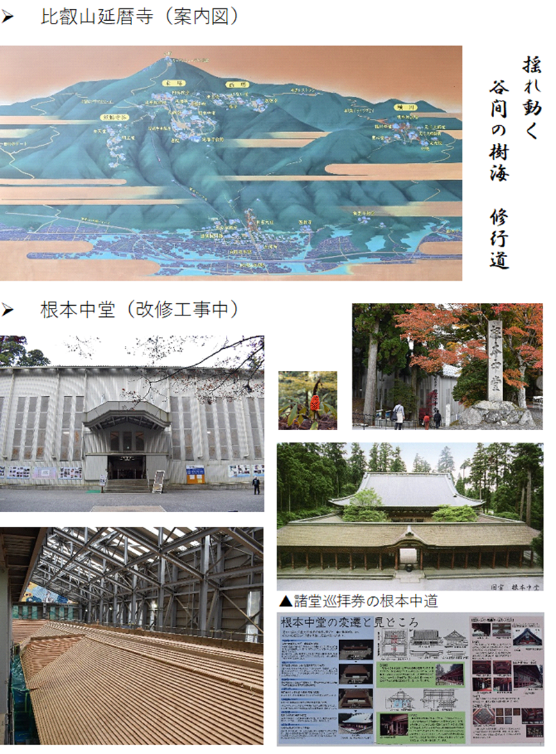 《ご案内》 平安京の鬼門に位置する比叡山は、標高848メートルの霊山である。この山を学問と修行の場としたのが延暦寺である。 延暦寺は、最澄が785(延暦4)年比叡山中に草庵を結び3年後に一乗止観院(いちじょうしかんいん)を創建したことにはじまる。このとき自刻の薬師如来像を安置し灯明を点じた。この灯は今日まで続き”不滅の法灯“と呼ばれる。 794(延暦13)年の平安京遷都にあたり、鬼門に聳える比叡山の鬼神鎮めの法要が一乗止観院で盛大に営まれた。桓武天皇という最大の外護者を得た最澄は、31歳の若さで朝廷の内供奉(ないぐぶ)に任ぜられ、一乗止観院も官寺に準じる待遇を受けた。804(延暦23)年から1年間、最澄は唐に渡って天台教学を学び、禅の教えや密教の伝法を受けて、円蜜一致といわれる日本天台宗の基礎をつくりあげた。帰国後の806(大同元)年、朝廷から天台宗に年分度者(国家公認の僧の資格)が割り当てられ、天台宗が正式に公認された。最澄は822(弘仁13)年6月4日に遷化したが、その7日後悲願であった比叡山独自の大乗戒壇の設立と天台僧育成制度の樹立が勅許され、比叡山の日本天台宗が名実ともに根をおろした。 こうして延暦寺は平安京の鬼門を護る王城鎮護の寺として崇敬され、平安末期から鎌倉時代はじめにかけては、法然・栄西・親鸞・道元・日蓮といった各宗派の開祖たちが比叡山で学び、後に比叡山は日本仏教の母山と呼ばれるようになったのである。 延暦寺の堂舎は、10世紀後期には現在のように東塔、西塔、横川の3地域を中心に整備され、隆盛を築いていた。その後火災のたびに再建が繰り返され、特に1571(元亀2)年の信長による焼き討ちにより、峰の西側に建つ瑠璃堂、相輪橖を除く全てが焼失したが、秀吉や家康の援助で堂塔の再整備が進んでいった。 総本堂である根本中堂は、徳川三代将軍家光により1640(寛永17)年に再建されたもので、桁行11間・梁間6間の規模は平安時代以来のもの。須弥壇のある内陣は、参拝者の目の高さに合わせるため、中陣・外陣より一段低い土間となっており、天台宗の仏堂の特色をよく示している。根本中道の前面には中庭を囲んで凹字形に廻廊が設けられている。この廻廊は1642(寛永19)年に完成したもので、柱を三列にならべ、内側を床敷、外側を石敷とする。屋根は根本中堂が瓦棒銅板葺に改められたが、廻廊は当初のとち葺のままである。根本中道は2016(平成28)年から大改修が行われているが、改修現場を間近に見ることができる。 西塔の中心となる転法輪堂は山内最古の1347(貞和3)年頃の建物で、「釈迦堂」とも呼ばれる。信長の焼き討ち後、園城寺(三井寺)の弥勒堂(金堂)を1595(文禄4)年に移築したもの。前方2間の外陣の床は板張とし、内陣は一段低い土間となっており、天台宗本堂の基本的平面構成となっている。 転法輪堂の南側に建つ2つのお堂が常行堂と法華堂。それぞれ5間四方の建物で、背面出入口を除いて左右対称に造られ、法華三昧、常行三昧の修行の堂である。渡り廊下をにない棒に見立て、両堂を合わせて「にない堂」と呼んでいる。 比叡山を修業の場とする延暦寺は、比叡山中に1,700haもの広大な境内を有する。これは京都市中心部の上・中・下京区を合わせた面積の8割に相当する。うち97%は山林であるが、明治維新で領地が大きく揺れた。新政府による社寺領上知令(明治4年)と地租改正(明治6年)により、山林1,128町歩(=ha)が上地され官有地となってしまったのだ。延暦寺は森林の下戻し請求を行い、不許可処分となったため、政府の国有土地森林原野下戻法(明治32年)制定を受け直ちに行政裁判所へ提訴し、1908(明治41)年、訴訟中の土地を除く1,020町歩の下払いが認められたのである。 こうして比叡山に広大な森林を有する延暦寺は、現在「比叡森林継承プロジェクト」を立ち上げ、宗教的雰囲気のある境内林と、境外林として水源林、天然林、観光林、経営林、資材林、里山林にゾーニングして適正に管理していこうとしている。これにより、宗教的荘厳さの中にあって、豊かな水を保ち、多くの動植物を育み、様々な資源となる森林を次世代に継承して行こうと努力している。 |