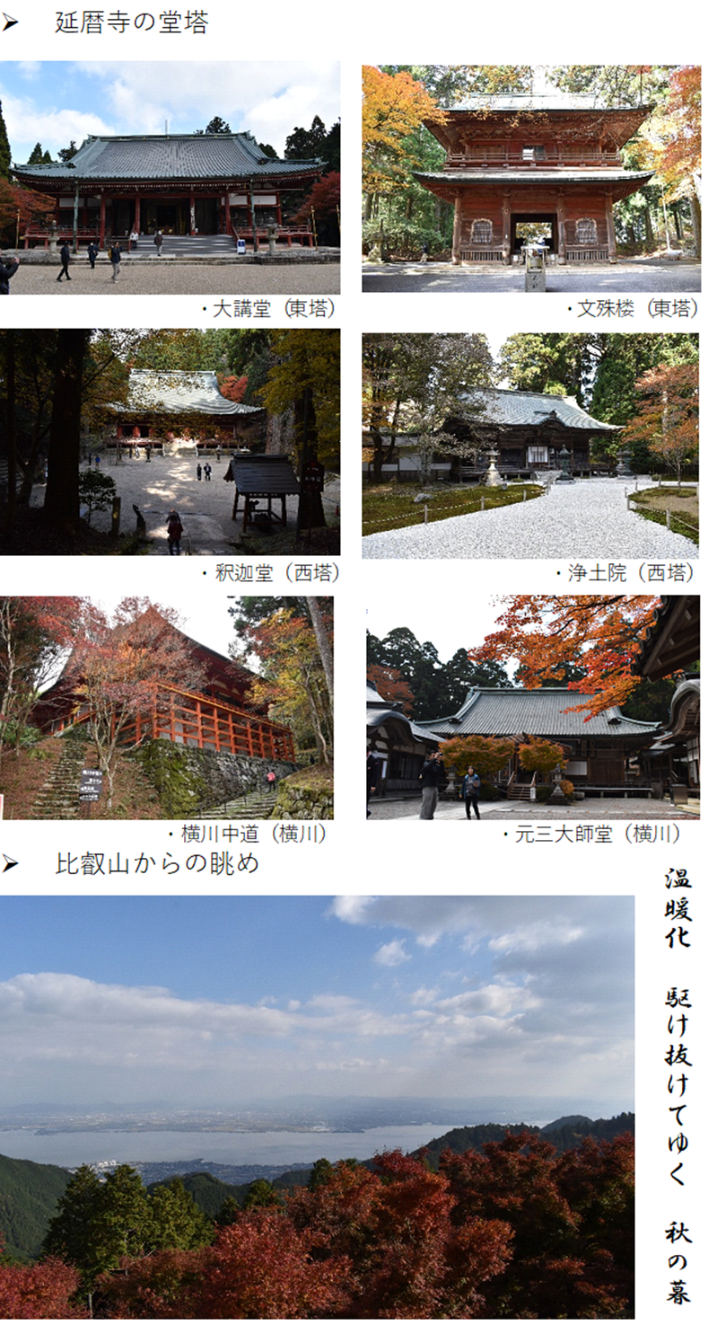 シリーズ《生き続ける文化財》 : 世界遺産『延暦寺』と比叡山 稲荷山から北に連なる東山三十六峰は、北端が比叡山といわれます。比叡山は平安京の鬼門に位置し、平安京遷都にあたり、桓武天皇は一乗止観院で鬼神鎮めの法要を営みました。その場所は比叡山延暦寺の根本中道です。延暦寺は比叡山中に100を超える堂舎を築き、後に法然、栄西、親鸞、道元、日蓮ら日本の仏教各派の始祖となった高僧を世に送り出した修行の寺です。そこで秋の比叡山に上り、東塔、西塔、横川の順に高低差が激しい延暦寺の境内を巡り歩きましょう。 |