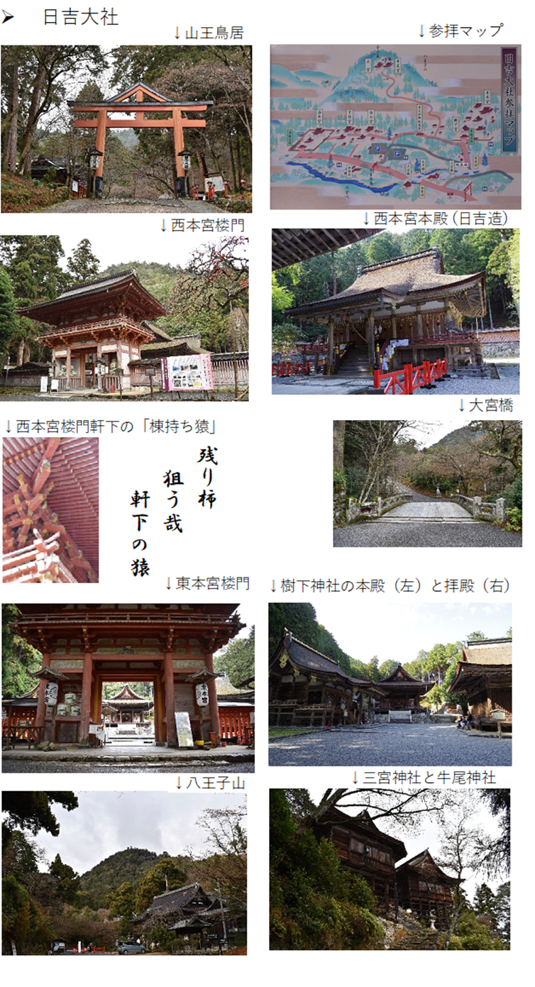 《ご案内》 「一山に立て籠っている」と言われた比叡山延暦寺が広く参詣者を受け入れる契機になったのは、1921(大正10)年の伝教大師(最澄)一千百年大遠忌であった。 延暦寺は古くから修行の山としての性格が強く、参詣者に対する関心は高くなかった。しかし大正後期ごろから、その姿勢が延暦寺や天台宗内で問題視され、思想の喧伝や参詣者の受け入れ、延暦寺への移動手段の改善が求められるようになった。その背景には、近代以降の寺社参詣が鉄道網の整備によって徒歩から鉄道へと変化し、都市近郊の霊山では、大正中期以降ケーブルカーの敷設が盛んに進められたという事情がある。 天台宗は大遠忌を教団再興の重要な契機と位置づけ、遠忌前年までの3年間で延べ240日以上に亘って全国各教区への巡錫(じゅんしゃく)(伝道)が行われ、延暦寺では記念事業として浄土院、大講堂などの堂塔改修や、主要参道の整備が行われた。また地方団参者の募集では、参拝団の移動手段に高い関心が寄せられ、鉄道や汽船を活用した輸送対策が実施された。その結果、大津と坂本を結ぶ江若鉄道の路線(三井寺下―叡山間)が遠忌法要の前日に開業した。 大遠忌が盛況裡に終わり、天台宗は報恩伝道をさらに5年間継続することとし、延暦寺では信者に対する本山参詣の勧誘を強く意識するようになった。しかし移動手段は江若鉄道と汽船のみであったため、利便性向上を図るための新規鉄道敷設に向けた動きをみせた。 京都方面では、叡山電気鉄道が出町柳―八瀬間の平坦線と八瀬―四明ヶ嶽間のケーブル線の免許を1922年に取得し、1925年9月に平坦線、同年12月にケーブル線が開業した。 坂本方面では、1919年ごろからケーブルカーの計画が進められ、比叡登山鉄道株式会社が坂本―叡山中堂間の免許を1924年に取得し、坂本からのケーブルカーが1927年3月に開業した。また同年9月には琵琶湖鉄道汽船が坂本駅-石山駅間を全通している。 こうして比叡山観光が活況を呈していったのである。 延暦寺へは叡山ケーブルに乗ったので、帰りは坂本ケーブルで下山した。全長2キロの坂本ケーブルは現役で日本最長のケーブルカー。両端の駅舎は国の登録有形文化財だ。ケーブル坂本駅の北には40ヘクタールもの広大な境内を有する日吉大社が鎮座する。 日吉大社は、崇神天皇の頃に創祀されたといい、全国3800余の日吉・日枝・山王神社の総本宮である。日枝山(比叡山)の大山咋神(おおやまくいのかみ)を祀り《東本宮》、その後大津京遷都のとき大和国から大己貴神(おおなむちのかみ)を移し《西本宮》、ともに祭神とした。平安時代には宇佐・白山・牛尾・三宮・樹下の神々も祀り「山王七社」と称した。境内には約40の社があり、それらを総称して「日吉大神」と呼ぶ。 社殿は信長の焼き討ちで焼失したが、その後復興し、西本宮本殿が1586(天正14)年、東本宮本殿が1595(文禄4)年に再建された(国宝)。両本殿は、切妻造の母屋の前面と両側面に庇をめぐらすという特殊な形で「日吉造(ひえづくり)」呼ばれる。床下にはかつて仏事を営んだ「下殿」と呼ばれる部屋があり、神仏習合の特殊形態として興味深い。 西本宮に向って参道を進み、大宮橋を渡ると山王鳥居が建っている。この鳥居は笠木の上に、山に見立てた合掌形の木を載せている。日吉大社が延暦寺の鎮守社であるところから神仏習合の象徴ともいわれ、他に類を見ないものだ。大宮橋は境内を流れる大宮川に架かる石橋で、走井橋・二宮橋とともに「日吉三橋」と呼ばれる重文だ。 東本宮の楼門を入ると、樹下神社の本殿が左手に、拝殿が右手に建っている。本殿と拝殿を結ぶ線が、東本宮と樹下神社で直交するという珍しい位置関係にある。 日吉大社の信仰の始まりとなった神体山八王子山の頂上付近には、三宮神社と牛尾神社の本殿・拝殿が並んで建っている。山上という地形に制約され、三間社流造の本殿に、懸造の拝殿が本殿正面縁を取り込むようにして建てられている。 境内には神格化された比叡山の猿もいて「神猿(まさる)」と呼ばれる。西本宮楼門の四隅の軒下には屋根を支える木像の「棟持ち猿」もいる。神猿は魔除けの象徴として祀られ、「魔が去る、何よりも勝る」に因んで大切にされてきた。 比叡山の麓に鎮座する日吉大社にはたくさんの物語が詰まっていた。 |