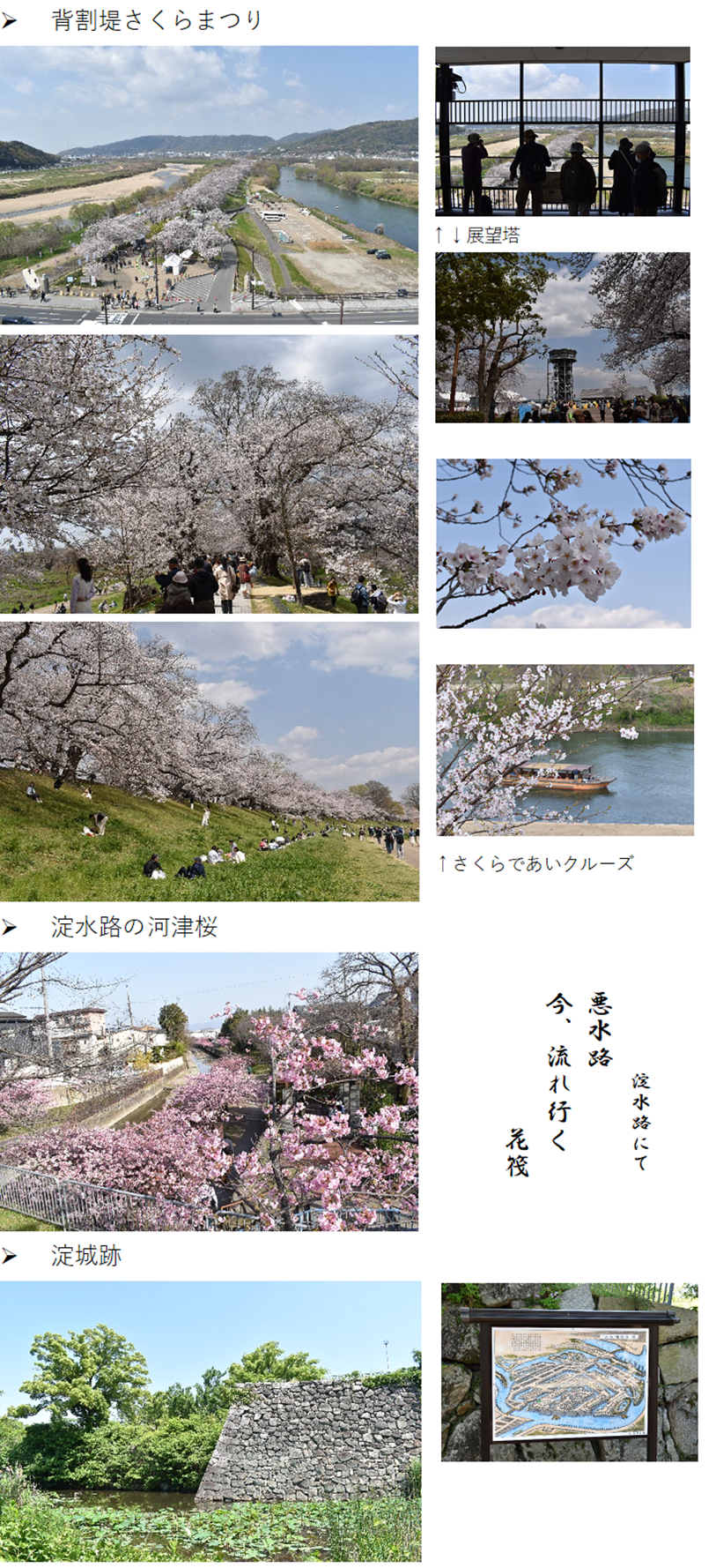 文化都市施設 : 背割堤『桜のトンネル』と三川合流域 京都盆地の南西端は京都府八幡市橋本北ノ町です。このあたりは桂川、宇治川、木津川が合流する三川合流地と呼ばれ、京都盆地の中で最も標高が低い場所です。その標高は10メートルなので、大阪湾の最低潮位との差は11.3メートル。ですから、三川合流地から下流の淀川は、僅か11.3メートルの高低差で約36キロ先の大阪湾まで水が流れているのです。三川合流地の先端部には1.4キロの背割堤が造られ、そこに桜並木があり「背割堤さくらまつり」が行われますので、桜巡りをしましょう。 |